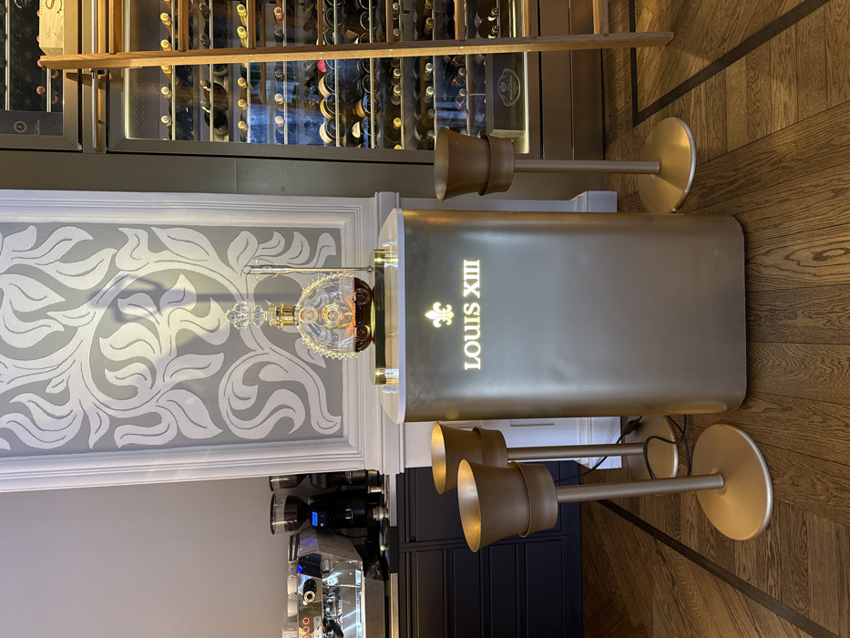 The image features a Louis XIII cognac display. A decanter rests on a platform in front of a gray wall with white floral designs. The display is flanked by two gold-colored lamps that sit on round bases. In the background, there's a wine rack and a coffee machine with grinder. The floor is wooden.