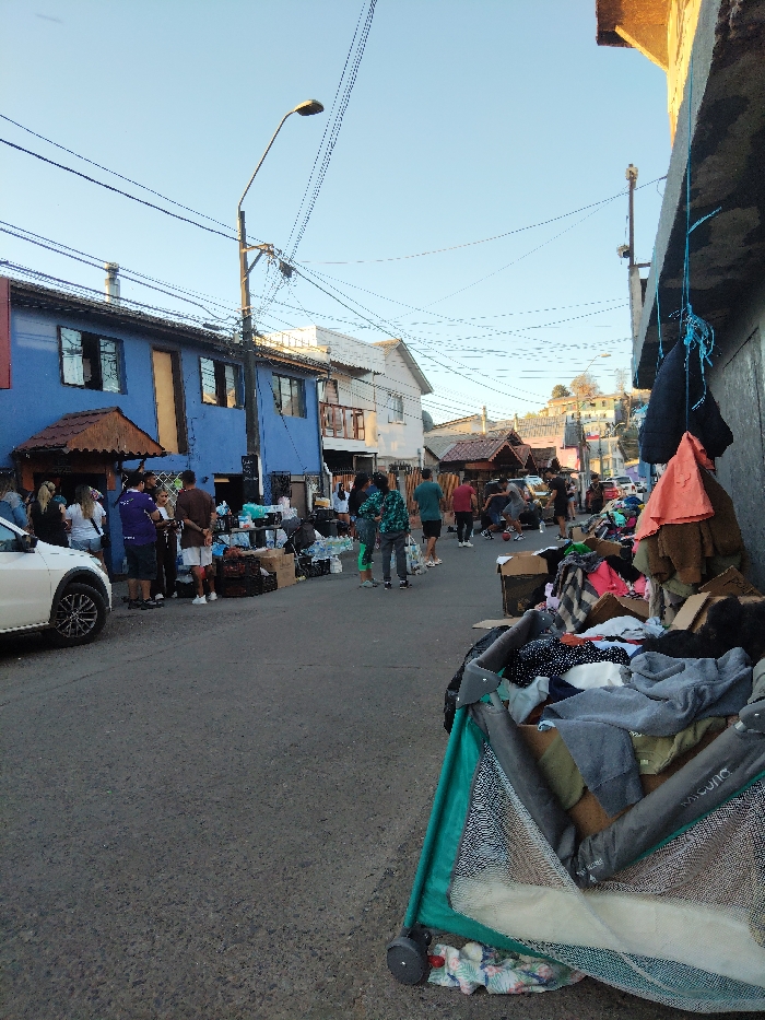 A bustling street scene with people milling about and vendors set up along the sides. A blue building stands on the left, contrasting with the clear sky above. Clothing piles up next to a green stroller, suggesting a market or sale. Power lines crisscross overhead, adding to the urban feel.