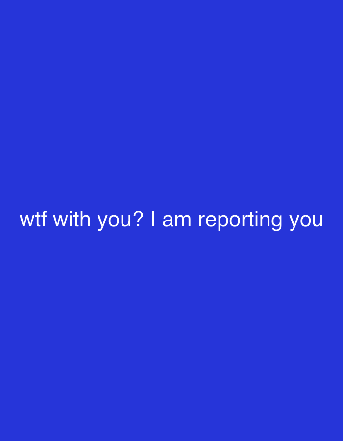 The image features a dark blue background. In the lower center of the frame, white text reads "wtf with you? I am reporting you." The text appears to be the focal point, suggesting a confrontational or accusatory message.
