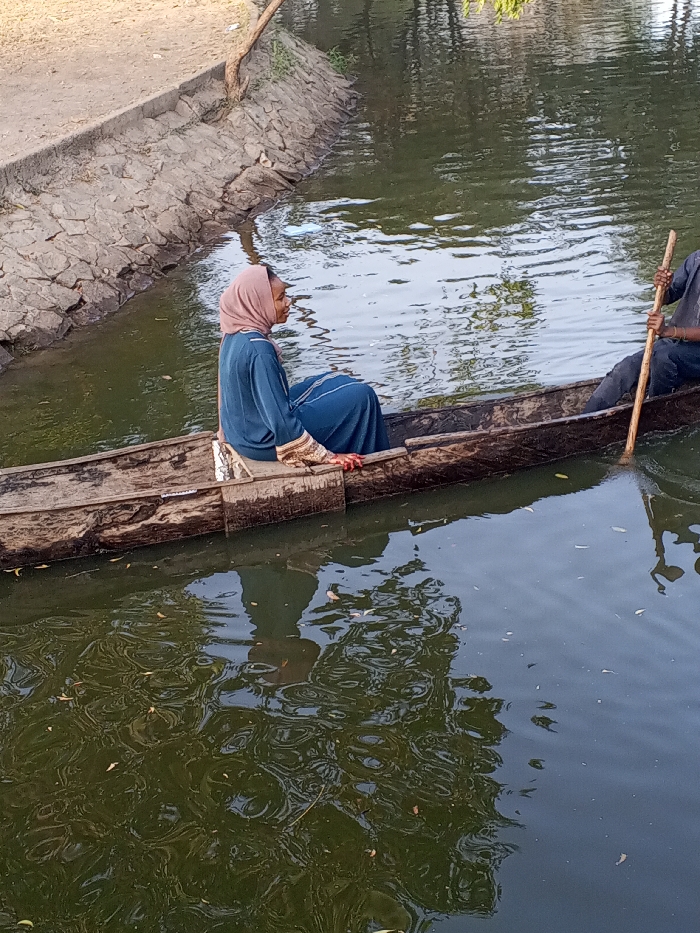 A woman wearing a hijab and blue robe sits in a wooden boat on a narrow canal. The canal bank is constructed of stone. A man in dark clothing stands at the other end of the boat, using a pole to navigate. The water reflects the boat and surrounding foliage. The woman looks to her right, towards the canal bank. The boat is old and weathered.