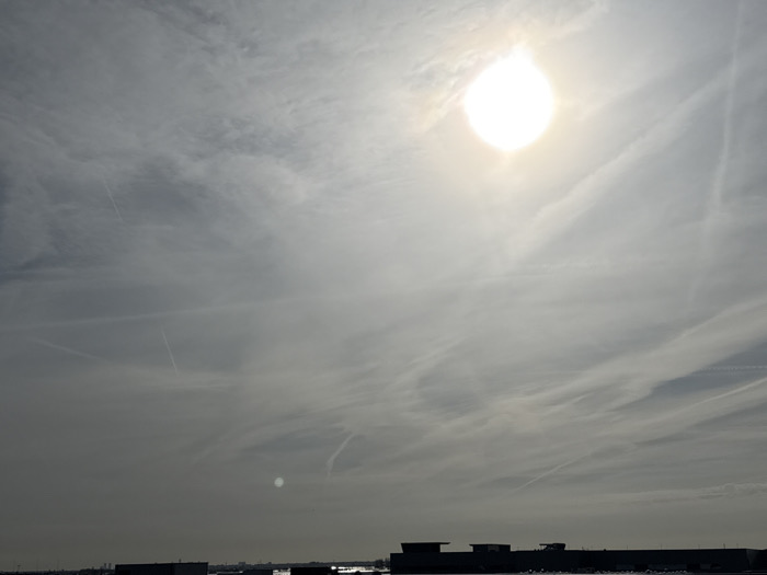 The image depicts an expansive sky over a distant horizon, situated in Naaldwijk, Netherlands. The sun, a prominent, overexposed white orb, is positioned in the upper right quadrant. The sky is covered by extensive, thin cloud formations and multiple intersecting aircraft contrails. A circular optical flare is visible in the lower-middle left sky. Along the lower edge, a dark, indistinct silhouette of low-rise architectural structures spans the horizon. To the right of these structures, a horizontal light-gray band indicates a body of water or reflective surface. No individuals or specific activities are discernible. The scene is illuminated by bright daylight, suggesting atmospheric diffusion.