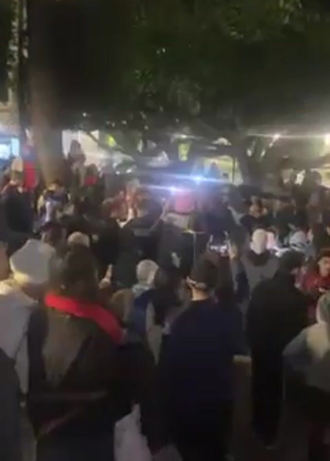 large crowd of people gathered at night in what appears to be a public square or park. There are trees in the background, and some buildings are visible as well. The crowd is facing towards the center, where it seems like there is some kind of performance or event happening. Many people are holding up their phones to record the event. Someone in a red outfit can be seen holding up a gold trophy. The atmosphere appears lively and celebratory.