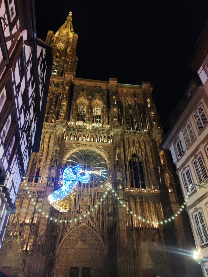 The Strasbourg Cathedral is captured at night, adorned with Christmas lights