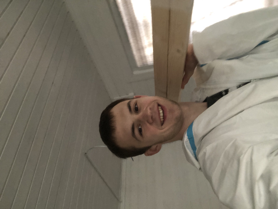 A young adult male is captured indoors in Starokorsunskaya, Russia, smiling at the camera while carrying three pieces of light-colored lumber on his right shoulder, supported by his right hand. He has short dark hair and wears a white hooded coverall with blue trim over a dark shirt. The room features white paneled walls and a white paneled ceiling with horizontal grooves. A window on the right side of the frame provides natural light. Wires or conduit are visible near the ceiling.