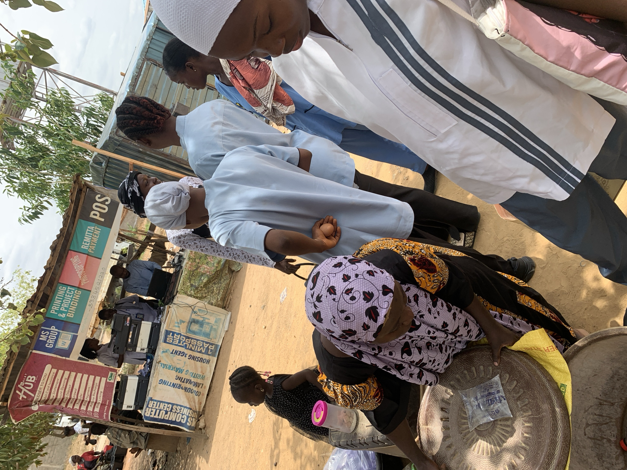 n outdoor scene in Keffi, Nigeria, with several individuals engaged in various activities around a makeshift business center