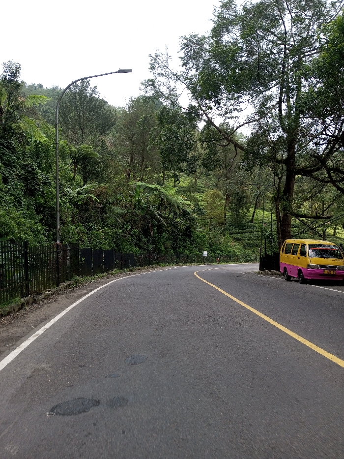 The image displays a paved asphalt road curving through a densely vegetated, hilly landscape in Boommlog, Bhutan, under an overcast sky. The road surface is dark gray, marked with a solid white line on the left edge and a solid yellow line indicating the center. Several dark, irregular stains are present on the road in the foreground. Along the left side of the road, a black metal fence separates the pavement from a steep, verdant embankment covered in various trees, shrubs, and prominent large ferns. A tall, gray street lamp with a curved arm and a rectangular fixture is positioned vertically on the left, extending above the fence line. On the right side of the road, a two-tone mini-van, yellow on its upper half and pink on its lower half, is parked on the shoulder facing away from the viewer. The van's front bumper is yellow, and its license plate shows "258 41". It is parked adjacent to a large tree with dark bark and extensive green foliage. Further into the scene on the right, beyond the van, dense green vegetation covers sloping terrain, with a small white rectangular sign visible in the mid-distance. No individuals are present, and no actions are occurring.