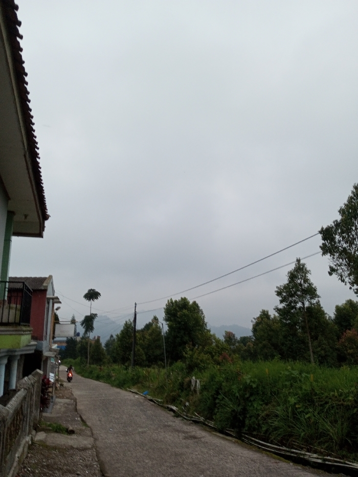 The scene depicts a street in Ivato, Madagascar, under an overcast, light gray sky. The image is taken from a slightly elevated position, looking down a paved, unlined road that curves gently to the right and descends into the distance. On the immediate left, the foreground features a portion of a building with a brown tiled roof and a light green exterior wall, connected to a lower structure with a red wall and a black balcony railing. A concrete wall with a patterned surface runs along the left side of the road. Further down the road on the left, additional residential-style buildings are visible. On the right side of the road and in the middle distance, dense green vegetation, including trees and overgrown bushes, lines the thoroughfare. Utility poles with multiple power lines span across the frame from left to right. Distant mountains or hills are visible through a light haze or fog on the horizon, behind the trees. A single motorcycle, with its headlamp illuminated, is visible on the road in the middle ground, heading away from the viewer. A lone rider is operating the motorcycle. No other individuals or vehicles are distinctly observable. The overall environment suggests a residential or semi-rural area with natural terrain.