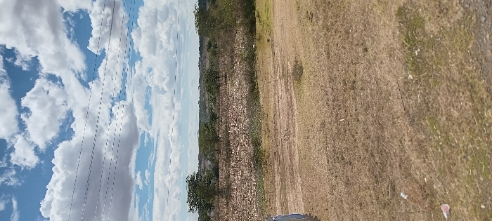 A landscape view features a bright blue sky with white, puffy clouds traversed by power lines. Adjacent is a band of lush green vegetation interspersed with trees. Next to this area is a wide expanse of dry, golden brown grass covering a significant portion of the scene. The image is oriented sideways, giving an unusual perspective.