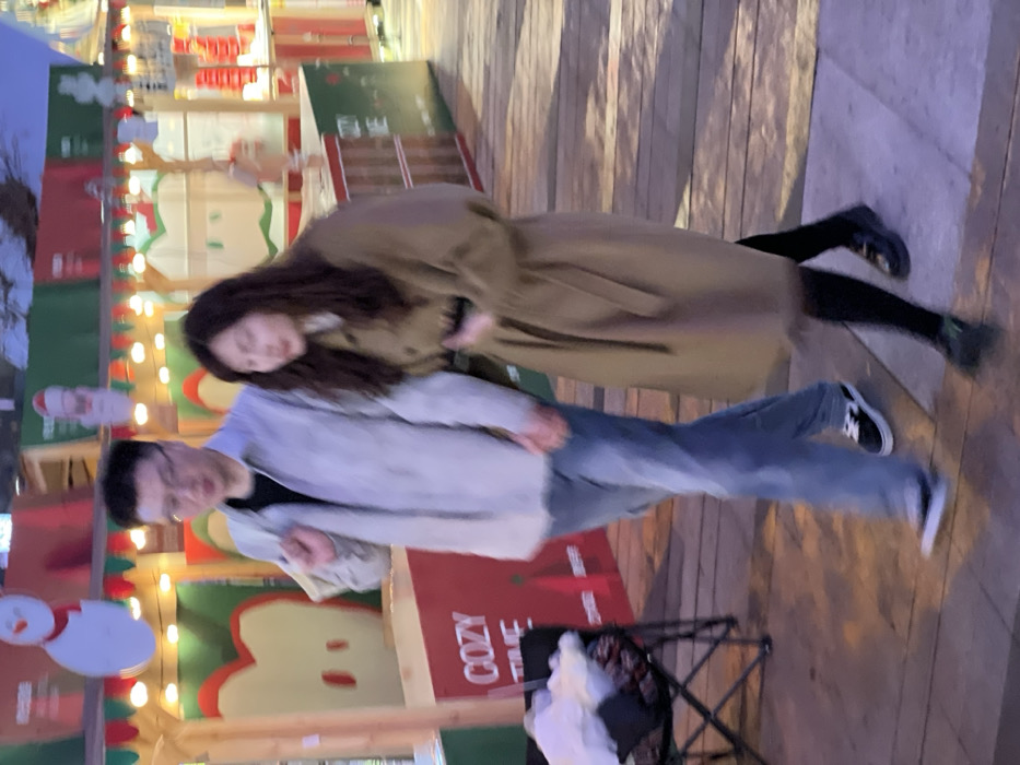 The scene depicts two individuals, a male and a female, walking outdoors in what appears to be a festive market area in Yuzhong District, China. The setting is illuminated by artificial lighting, indicating dusk or night. The male, positioned on the left, is wearing a light-colored long-sleeved shirt over a dark undershirt, blue jeans, and black sneakers with white soles. He wears glasses and has short, dark hair. He carries a light-colored item, possibly a jacket or bag, draped over his left shoulder. His left hand is interlocked with the female's right hand. The female, to the right of the male, wears a long, brown or tan trench coat cinched at the waist with a dark belt, black leggings or tights, and dark flat shoes. She has long, dark, wavy hair. Her right hand is clasped with the male's left hand. Both individuals are in mid-stride, moving from left to right across the frame. The background features multiple temporary market stalls or booths constructed with wooden frames and decorated with red and green panels. Some panels display white apple motifs. White snowman cutouts and other festive decorations, along with strings of warm yellow lights, adorn the top of these structures. A red sign on a stall to the left reads "COZY TIME" in white text. The ground surface consists of wooden planks interspersed with lighter-colored paving sections. A black folding chair with white material draped over it is visible on the far left of the frame.