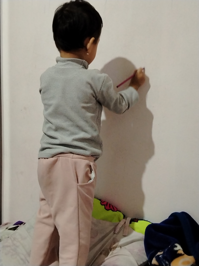 A young child with short dark hair stands facing a white wall, drawing with a pink crayon
