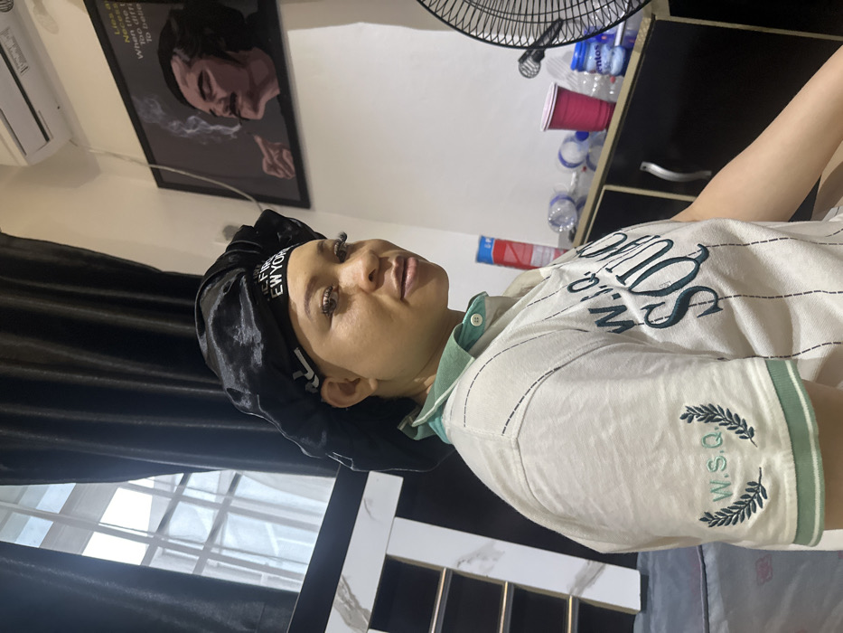 The scene is an indoor room located in Ado, Nigeria. A light-skinned individual is positioned in a medium shot, facing the viewer's right with a neutral expression. The individual wears a black satin bonnet with visible white text "NEW YORk" (partially obscured) and a white polo shirt featuring a green collar, green striped sleeve cuffs, and dark vertical pinstripes. The shirt's front displays "W.S.Q. SQUAD" in large green text, and the left sleeve has an embroidered laurel wreath logo with "W.S.Q." The background to the left of the individual includes a partial view of a white and dark-toned furniture unit, adjacent to a window obscured by dark curtains. To the right, a white wall-mounted air conditioning unit is visible. Below it, a framed piece of artwork depicts a stylized man smoking a pipe, with yellow text above him. In the immediate foreground to the right, a black electric table fan is positioned. Below the air conditioner and artwork, on a dark flat surface, various items are scattered, including a red plastic cup, clear plastic bottles, and a blue cylindrical container labeled "mentos." The room has light-colored walls and appears to be illuminated by artificial light.