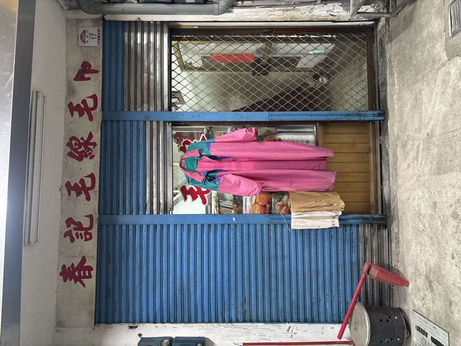 The scene depicts the facade of a building located at No. 17 Guangfu Road, Yilan City, Taiwan, as identified by a white plaque with red Chinese characters on the upper right side of the facade. The building front features a faded white or light grey upper section with a prominent horizontal sign displaying red Chinese characters: "春記毛線毛巾" (Chun Ji Yarn Towel). A fluorescent light fixture is installed above this sign. The building's entrance consists of two sections. The left section is predominantly covered by a closed blue corrugated metal roll-down shutter, which is partially raised from the bottom, revealing a wooden panel door below. A long, vibrant pink raincoat or windbreaker with teal and purple color-block shoulders hangs on a white plastic hanger from the lower edge of this blue shutter, obscuring part of the wooden door. Below the raincoat, two smaller towels, one off-white and one light tan, are draped over another hanger, also suspended from the shutter. The right section of the entrance is a glass door fronted by a brown metal security gate with a diamond grid pattern. This gate is partially open. Through the glass, an interior space with reflections is visible, including a pair of white shoes on the floor inside and a red object in the background. The ground directly in front of the building is concrete, exhibiting various stains and marks. To the far left, a black cylindrical metal incinerator bin with a silver lid sits on the ground. A red shovel or scoop with a long handle leans against the left side of this bin. Two light-colored utility boxes are mounted on the wall to the left of the blue shutter. A grey vertical drainpipe runs down the wall on the far right side of the frame, and a section of a metal table or shelving unit is visible at the extreme right edge. No individuals are present.
