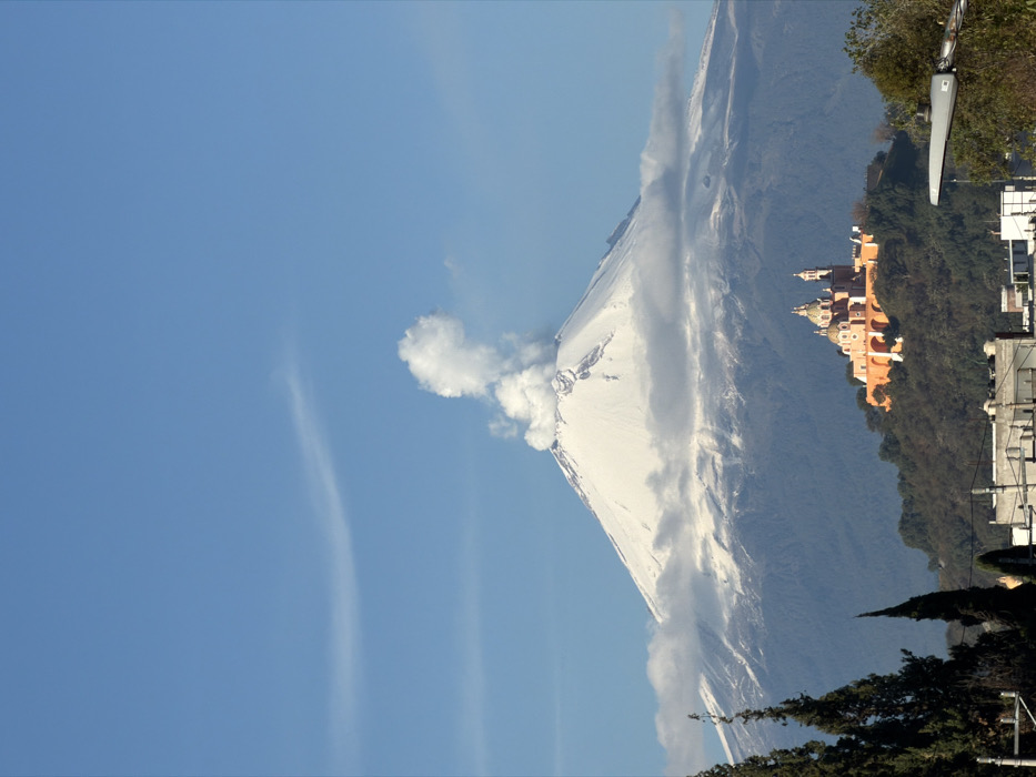 The scene captures a panoramic outdoor view from San Andrés Cholula, Mexico. In the background, the snow-capped Popocatépetl volcano is the dominant feature, with its upper slopes covered in white snow and lower sections cloaked in dark green foliage. A prominent plume of white smoke or steam actively rises vertically from the volcano's summit crater. Horizontal cloud formations are present around the volcano's mid-section. In the mid-ground, the Santuario de Nuestra Señora de los Remedios church, distinguished by its orange and yellow coloring, multiple domes, and spires, is situated atop a large, conical, tree-covered hill (the Great Pyramid of Cholula). The immediate foreground partially displays dark green coniferous trees on the left and a gray utility light fixture on the right. Below the central hill, indistinct rooftops of urban structures are visible. The sky is clear, bright blue, with a few wispy white clouds at higher altitudes. No individuals are visible.