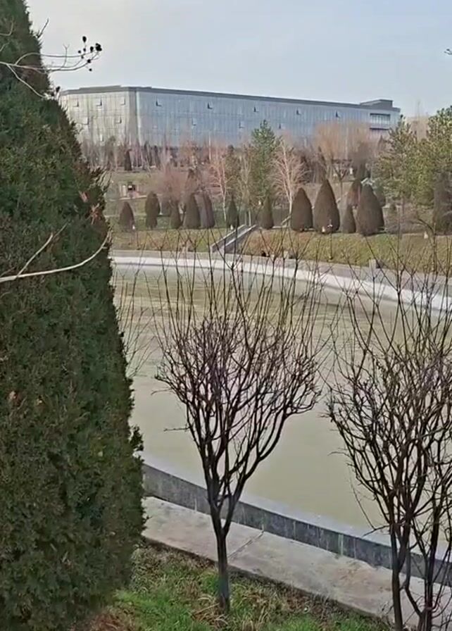 The scene is a landscape with a building in the background. A body of water, possibly a pond, is in the midground, lined by a concrete border. In the foreground, there are several small, bare trees and a large, green evergreen tree on the left. The sky is overcast.