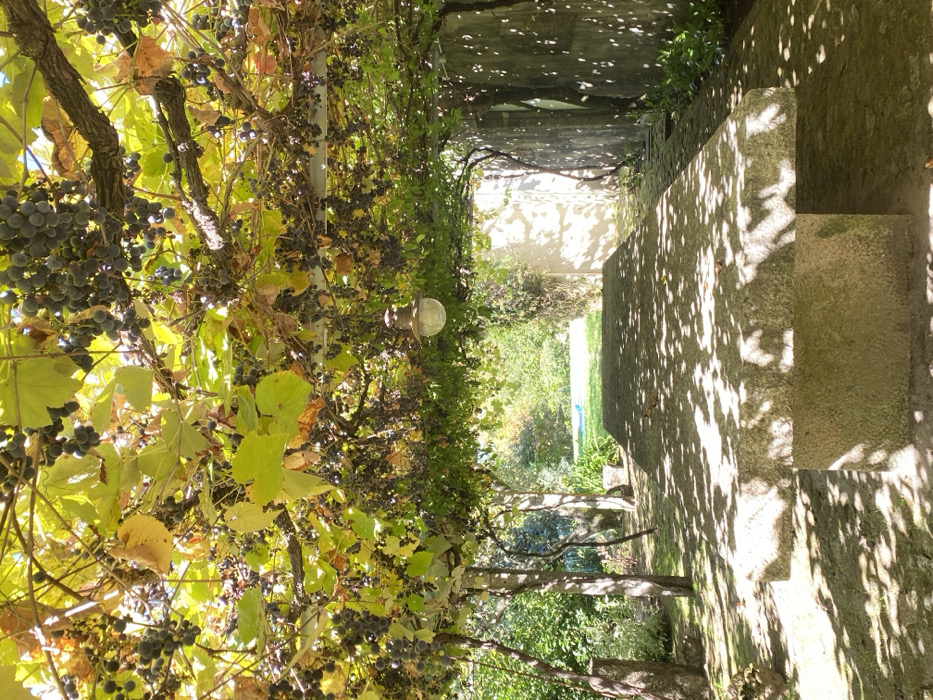 This image displays an outdoor setting under a grape arbor in the city of Ponte de Lima, Portugal. Overhead, a dense canopy of green and yellowing grape leaves covers a trellis structure, from which numerous clusters of dark purple, ripe grapes hang. A single, clear glass, spherical outdoor light fixture is suspended centrally from the arbor's metal supports. Beneath the arbor, a long, rectangular table, constructed from light-grey, rough-hewn stone, occupies the foreground. Dappled sunlight filters through the leaves, casting intricate shadows across the table's surface and the ground below, which appears to be a mix of dirt and short grass. To the left, mature trees and lush green foliage are visible. To the right, a light-colored concrete or stucco wall runs parallel to the table, also marked with dappled shadows. In the distant background, beyond the immediate garden area, a light blue rectangle suggests the presence of a swimming pool amidst further greenery. No individuals are present in the scene, and no actions or interactions are depicted.