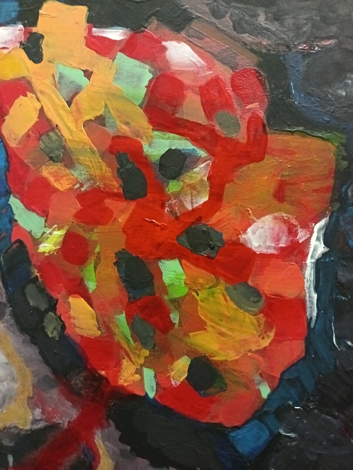 An abstract painting features a predominantly red, heart-like form. Bold strokes of yellow, green, and white add highlights. Dark, roughly circular shapes are scattered across the red, resembling seeds or spots. The background is a blend of black and dark blue, creating a contrasting backdrop. The brushstrokes are thick and textured, giving the artwork a tactile quality. A few strokes of white and red extend beyond the central form, adding a sense of movement.
