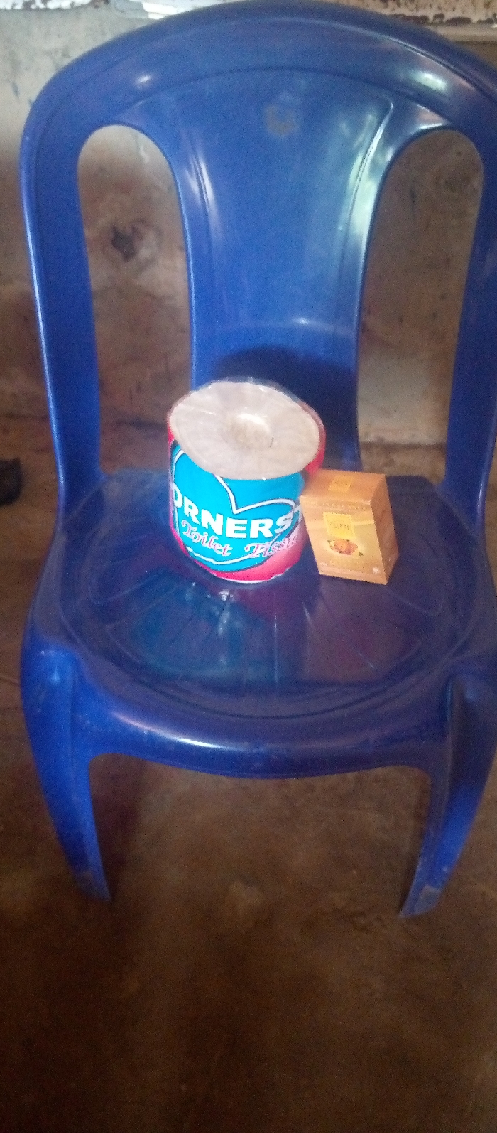 The scene, situated in Ukwu-Abwa, Nigeria, displays an indoor environment. A solitary, unoccupied blue plastic chair is centrally positioned. On the chair's seat, two distinct objects are present: a roll of "CORNERS Toilet Tissue" encased in clear plastic with a red and blue label, and a small, light brown rectangular cardboard box positioned to the right of the toilet tissue. The box features an orange fruit graphic on its visible face. The background consists of a light brown wall, possibly unpainted, exhibiting some minor discoloration. The floor beneath the chair is dark brown. No individuals, actions, or interactions are visible within the frame.