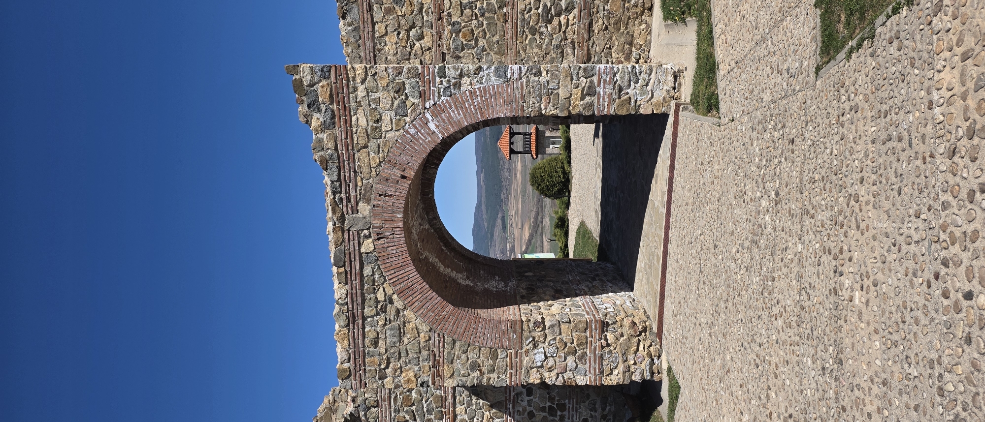 A vertical, medium shot shows an arched window in a stone wall at the Tsari Mali Grad Fortress in Belchin, Bulgaria. The wall is constructed of tan stones of irregular sizes and shapes with lines of bricks running horizontally. The rounded arch is made of red bricks. Through the window, there is a view of rolling hills, a small building with a red roof, and a blue sky. To the right, there is a stone-paved walkway. The sky is clear blue.