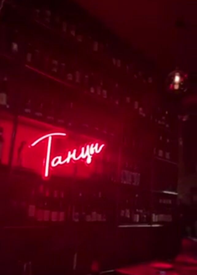 inside of a dimly lit bar or club decorated with red neon lights and various chandeliers. There is a neon sign in Russian, a wall lined with wine bottles, and patrons mingling. The camera pans upwards, revealing the bar's overall interior and lighting scheme.