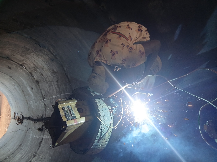 Inside a concrete tunnel, a person is welding. The individual wears a patterned shirt and protective gear. Welding sparks illuminate the dark tunnel interior. A wheeled apparatus with attached cables sits nearby. The scene suggests a construction or repair operation within a confined space.