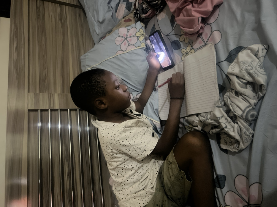 A child lies on their side on a bed covered in patterned bedding, holding a brightly lit smartphone in one hand. The other hand holds a pencil over a lined notebook. The child is wearing a white, short-sleeved shirt with dark specks and beige shorts. The scene appears to be indoors, next to a wardrobe. The child seems to be studying or completing homework, using the phone as a source of information or light.