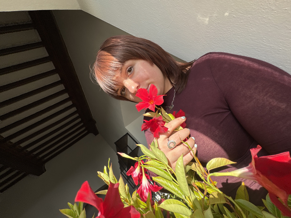 A female subject is depicted in a close-up, slightly upward-angled shot, appearing to be in an indoor or semi-outdoor setting in Cortona, Italy. She has medium-length reddish-brown hair with bangs. Her right hand, with light-colored nail polish and a silver-toned ring featuring a circular design on the ring finger, holds a stem of vibrant red, trumpet-shaped flowers, with one bloom positioned near her lips. She wears a dark burgundy long-sleeved top and a thin silver-toned chain necklace. The background consists of a sunlit, light-colored wall to the subject's right and dark wooden ceiling beams against a lighter overhead structure to the left, indicative of traditional Tuscan architecture. A significant portion of a plant with green leaves and multiple red flowers occupies the left side of the frame.