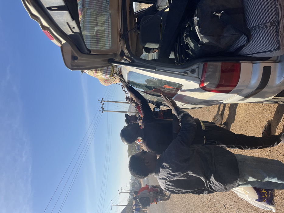 Two people secure luggage atop a car on a sunny day. One person wears a grey jacket and jeans, while the other is in a black top and pants. The car trunk is open, revealing more luggage inside. Power lines stretch across the clear blue sky. Other people and motorcycles are visible in the background on what appears to be a road.