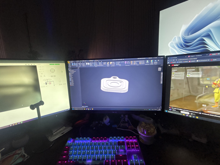 The scene depicts a multi-monitor computer workstation within a dimly lit room, located in Dimitrovgrad, Bulgaria. Three monitors are positioned on a dark desk. The leftmost monitor displays a largely white interface with technical schematics. The central monitor presents a CAD software application, showcasing a three-dimensional model of a white, oblong object featuring a central depression and a smaller circular aperture. The rightmost monitor displays a video game interface with "VICINITY" and "INVENTORY" indicators, featuring a character in a yellow suit holding a weapon. Above the central and right monitors, a projector casts an abstract light blue image, consistent with the Windows 11 operating system wallpaper, onto the dark wall. An RGB-backlit mechanical keyboard, transitioning from blue to pink, rests on the desk. To the right of the keyboard, a lidded clear container holds a snack. A white computer mouse is partially visible to the left of the keyboard. No individuals are visible.