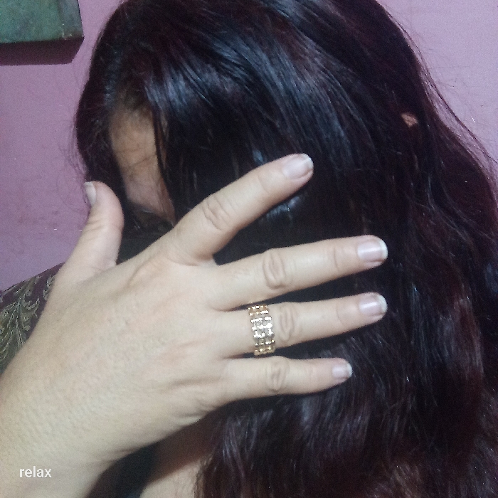 A woman's face is partially obscured by her hand, adorned with a gold ring. Her dark, flowing hair surrounds her hand, adding depth to the image. The lighting is soft, creating a sense of intimacy. The background is a muted rose color, with what appears to be a dark picture frame at the upper-left corner. "Relax" is written in lower-case letters at the lower-left corner.