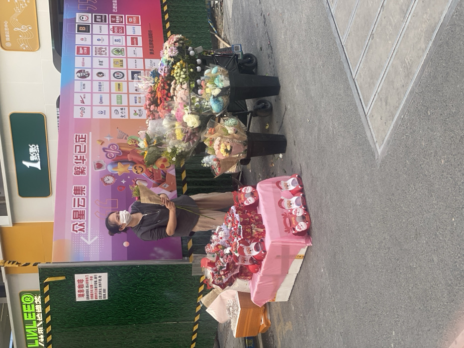 A street scene shows a woman in a mask holding a bouquet near a flower stall. The stall has a variety of flowers and gifts, including Santa Claus themed items. Behind the stall, a promotional sign displays numerous brand logos and Chinese characters. The area appears to be near a commercial building with a green sign featuring the logo "LINLEE". The ground is paved, and there is partial sunlight.
