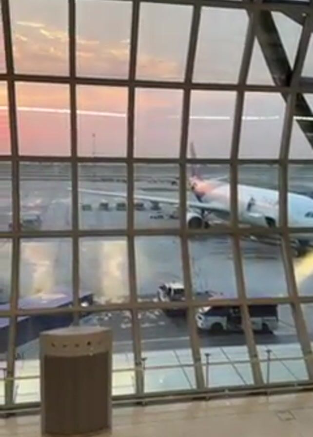 view from inside an airport terminal through a large, multi-paned window