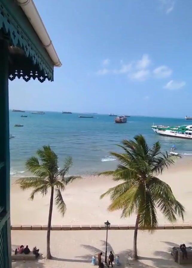 view from a balcony overlooking a beach. The sky is blue with scattered white clouds. The ocean is visible with several boats in the distance. Closer to the shore, a white ferry is docked near a harbor area with cranes and shipping containers. Palm trees line the beach, and a paved walkway runs parallel to the beach. People are sitting on a concrete bench, and others are walking along the walkway. The camera provides a static view from the balcony, partially obstructed by the balcony's ornate structure.