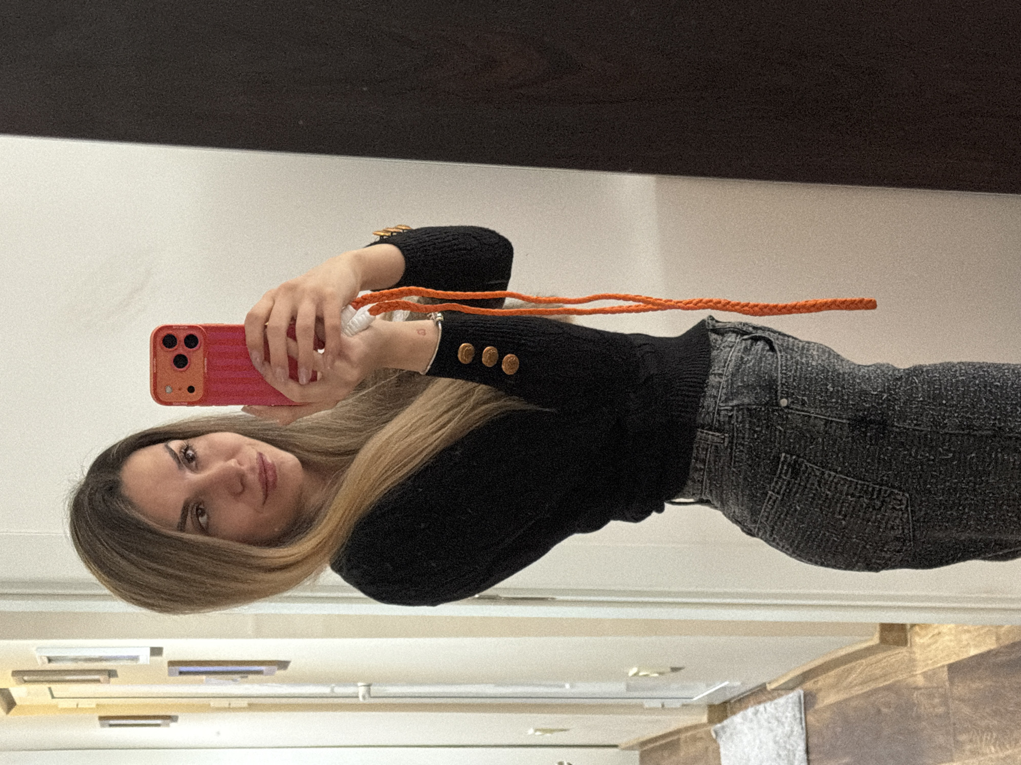 A woman is taking a selfie indoors. She is holding a red smartphone in her hands. She is wearing a black long-sleeved sweater with gold buttons on the sleeve and dark gray jeans. She has long blonde hair. The background includes a wall with a dark brown band at the top and a ceiling with recessed lighting. There is no indication of this image being in Vratsa, Bulgaria.