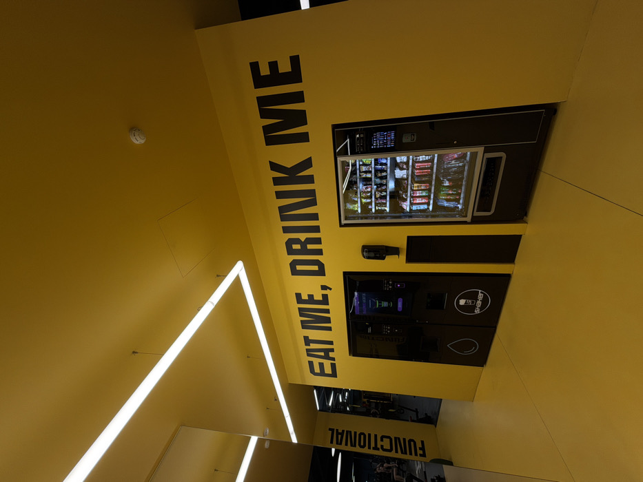 Two vending machines are installed in a yellow wall. The upper machine is filled with various drinks and snacks, while the lower one offers protein shakes. "EAT ME, DRINK ME" is printed vertically in bold black letters on the wall adjacent to the machines. Fluorescent lights are on the ceiling. A sign with "FUNCTIONAL" printed is visible. A smoke detector is installed on the ceiling.