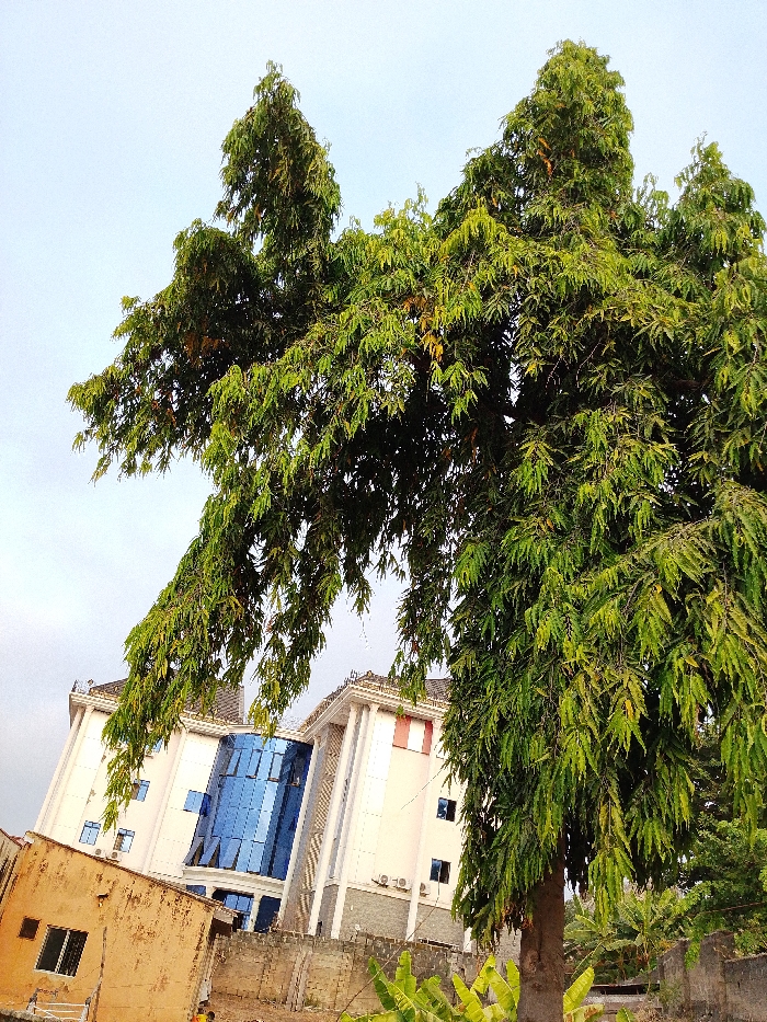 A tall building with blue glass windows and a white facade stands behind a large tree with dense green foliage. The tree partially obscures the building, with its branches extending towards the left side of the frame. In the foreground, a shorter, yellow building with a single window is visible. The sky is overcast, providing a muted light to the scene. Banana leaves peek out from behind the tree.