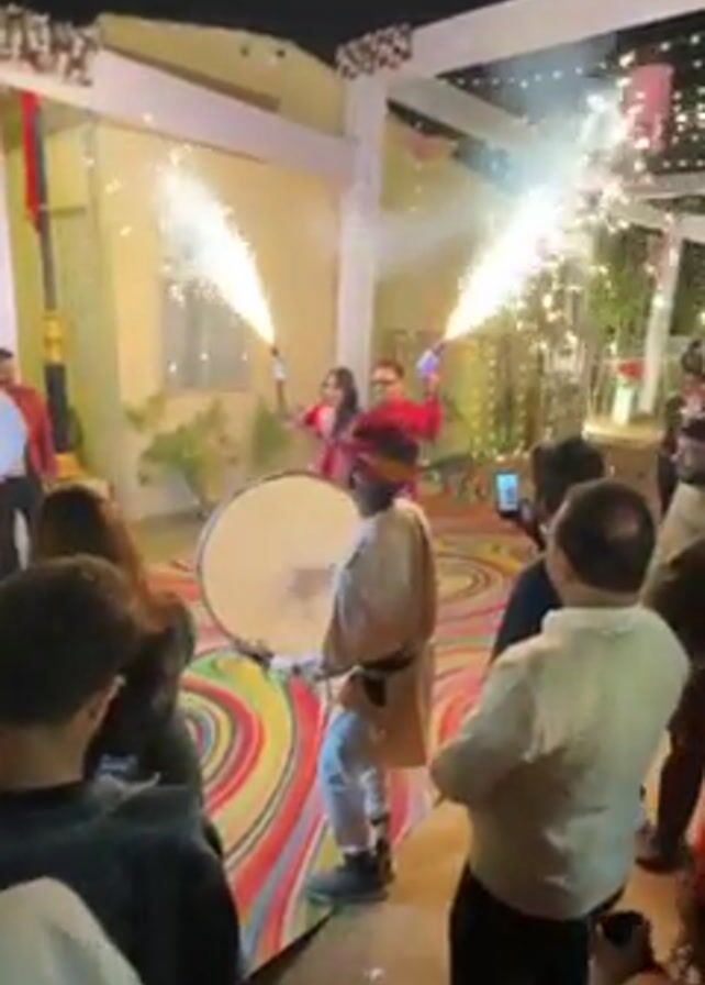 A celebratory event is in progress, captured in an eye-level shot outdoors at night. Two individuals, a woman in pink and a man in red, hold up sparklers that spew bright white sparks high into the air. A drummer in traditional attire stands centered behind them, ready to play a large drum. A crowd of people surrounds the group, many holding up phones to record the scene. The environment is decorated with hanging lights and what appears to be a makeshift stage area. The ground features a colorful, swirly pattern. Buildings are visible in the background, adding depth to the frame. The atmosphere is festive and lively, suggesting a wedding or similar celebration.