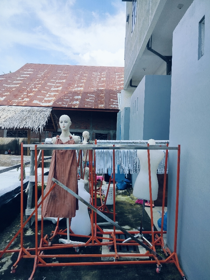 This image, captured in Cottarum Tunong, Indonesia, depicts an outdoor area between two structures, functioning as a storage or work yard. In the immediate foreground and midground, a series of interconnected, orange-painted metal clothing racks on wheels occupy the space. A prominent pale-skinned female mannequin, adorned with a pleated, reddish-brown sleeveless garment, stands on a pole support within the framework of these racks. Behind it, a smaller mannequin head is visible. To the right, a white, headless torso-only dress form is positioned on a stand. A long line of numerous white plastic clothes hangers hangs from one of the metal bars of the rack system. The ground below consists of concrete or pavement, exhibiting patches of green moss or algae, and scattered items including blue plastic bags and white buckets. In the background to the left, a building with a large, heavily rusted corrugated metal roof is visible, partially obscured by a section of a thatched roof below it. Its walls appear to be constructed from unrendered brick or concrete. To the right, a modern-style, multi-story building with light grey or off-white painted walls and visible windows and a gutter system stands tall, forming a sharp architectural contrast. The scene is illuminated by natural light under a partly cloudy blue sky. No human figures are present, and no active interactions or specific actions are occurring.