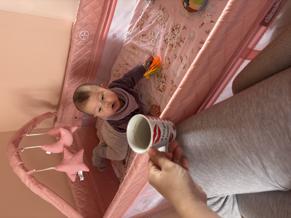 An indoor scene depicts an infant in a pink Chicco playpen, observed from an adult's perspective. The infant, wearing a purple long-sleeved top and light grey footed pants, lies prone on a pink sheet patterned with bunnies and clouds, facing forward. A colorful teether toy, featuring orange, yellow, and blue elements, is situated near the infant's right hand. A pink mobile arch with two pink fabric stars and one pink fabric crescent moon is suspended over the playpen. In the immediate foreground, an adult's left hand, clad in light grey loungewear, holds a white mug adorned with red lip print decals and the phrase "I love you forever," containing residual dark liquid. The room's walls are a light peach color. No visual elements within the image confirm a specific location in Byala Slatina, Bulgaria.