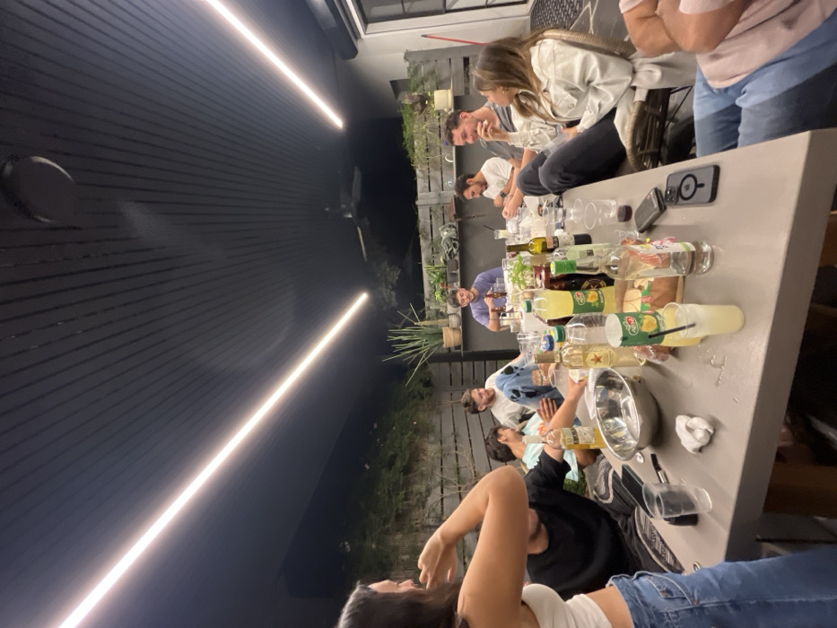 The image depicts an outdoor evening social gathering of eight individuals seated around a rectangular table under a dark, slatted patio or pergola ceiling in Modiin-Maccabim-Reut, Israel