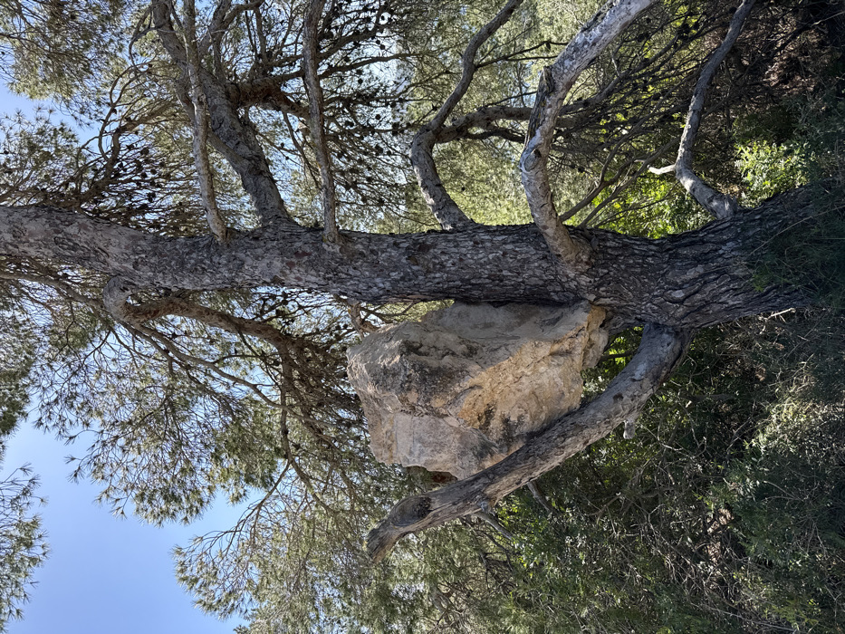 This image presents a natural outdoor scene in Sant Joan de Labritja, Spain, under bright daylight. A large, irregularly shaped, light-colored rock is firmly wedged within the lower section of a mature pine tree. The rock, approximately trapezoidal and exhibiting a rough, weathered surface with some darker gray and brown discolorations, rests between the tree's main trunk and a thick, upward-sloping branch extending to the left. The pine tree features a robust central trunk with deeply fissured, gray-brown bark. Its branches, some appearing desiccated, are sparsely covered with green needles and bear numerous small, dark pinecones. Dense green Mediterranean shrubbery and undergrowth are visible in the foreground and background, particularly to the lower left. The upper portion of the image reveals a clear, bright blue sky. No human subjects or discernible human-made objects are present.