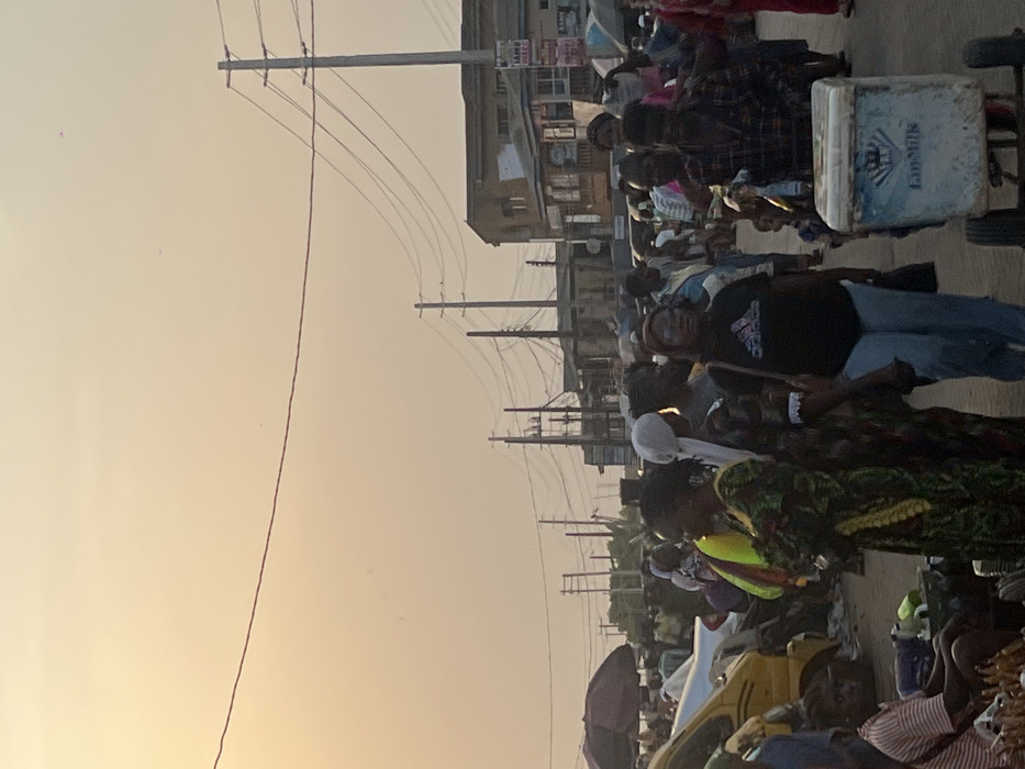 A crowd of people fills a street lined with buildings and utility poles under a hazy sky. Some individuals are clearly visible, wearing casual clothes like t-shirts, jeans, and patterned dresses. A cooler on a cart is also visible. The setting suggests a busy market or public area, with many people close together.