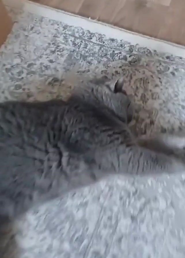 close-up of a gray cat lying on a patterned carpet. The cat is initially shown from a distance, then the camera moves closer to its face. The cat's eyes are half-closed and it appears sleepy or annoyed. The background is slightly blurred, but shows part of a wall and floor.