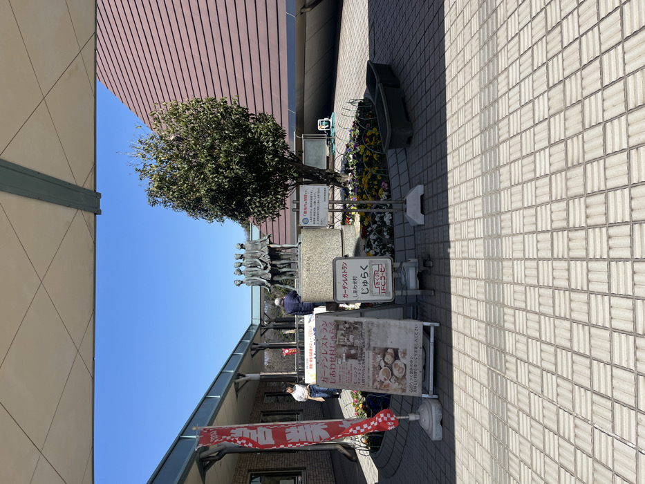 An outdoor scene at Shiawase Mura (Happiness Village) in Tokai City, Aichi Prefecture, Japan, unfolds under a clear blue sky on a sunny day