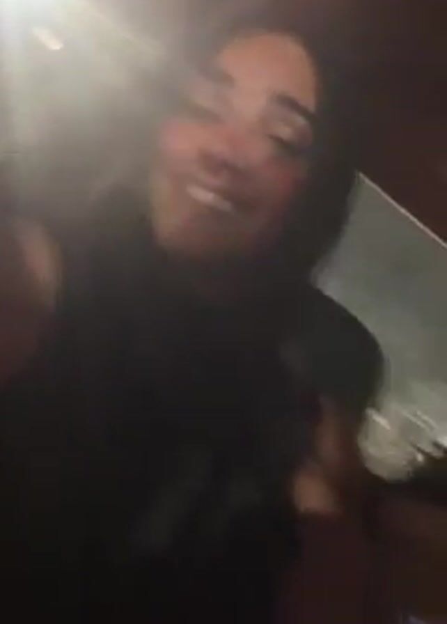 three women inside a vehicle, likely a car, at night. The lighting is dim and mainly comes from a bright source outside, partially obscuring the subjects' faces. The camera focuses mainly on one woman with dark hair, who looks directly into the camera and smiles. Behind her and to the side, another woman is visible briefly, and a third one is seen near the window. The background shows blurred street lights and building exteriors, suggesting they are driving through an urban area.