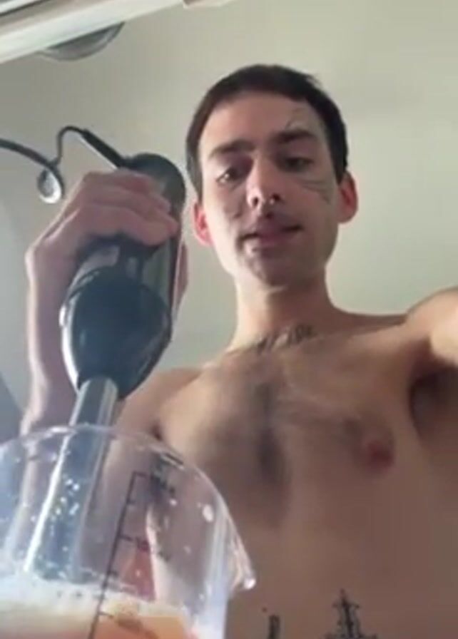 A shirtless person with facial and body tattoos is using an immersion blender in a clear plastic pitcher filled with a peach-colored liquid. The pitcher has milliliter markings, and chunks of fruit are visible at the bottom. The person is holding the blender and looking directly at the camera. The background shows a white ceiling.