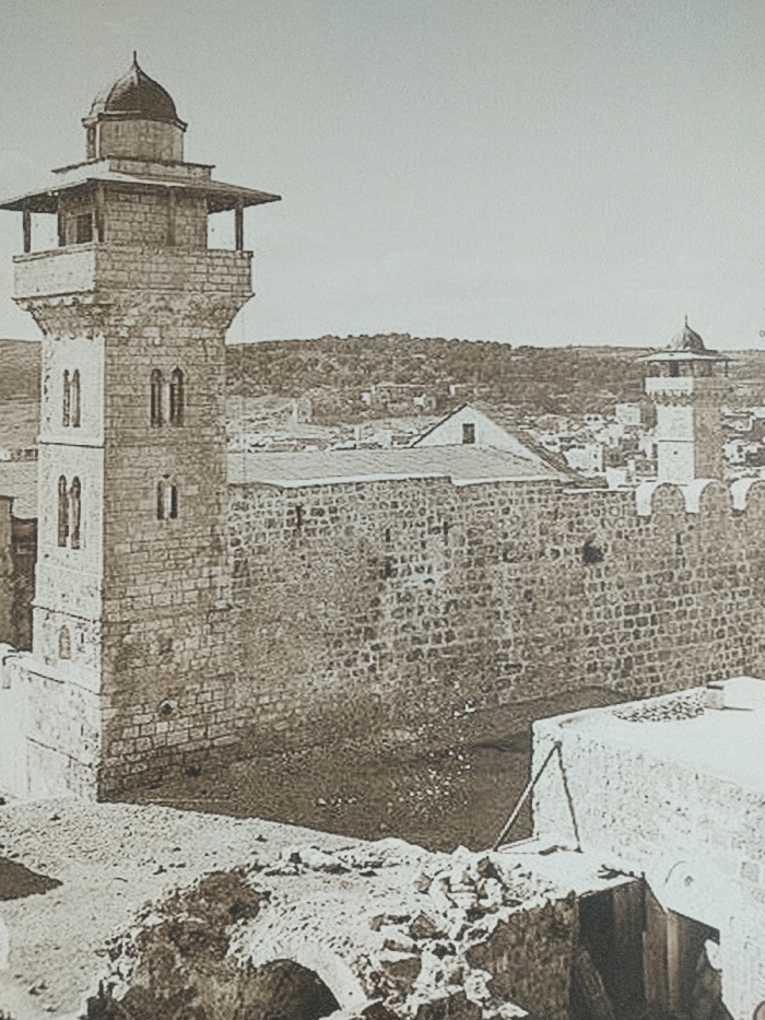 This sepia-toned, historical photograph depicts the Sanctuary of Abraham (Ibrahimi Mosque) in Hebron, Palestinian Territory