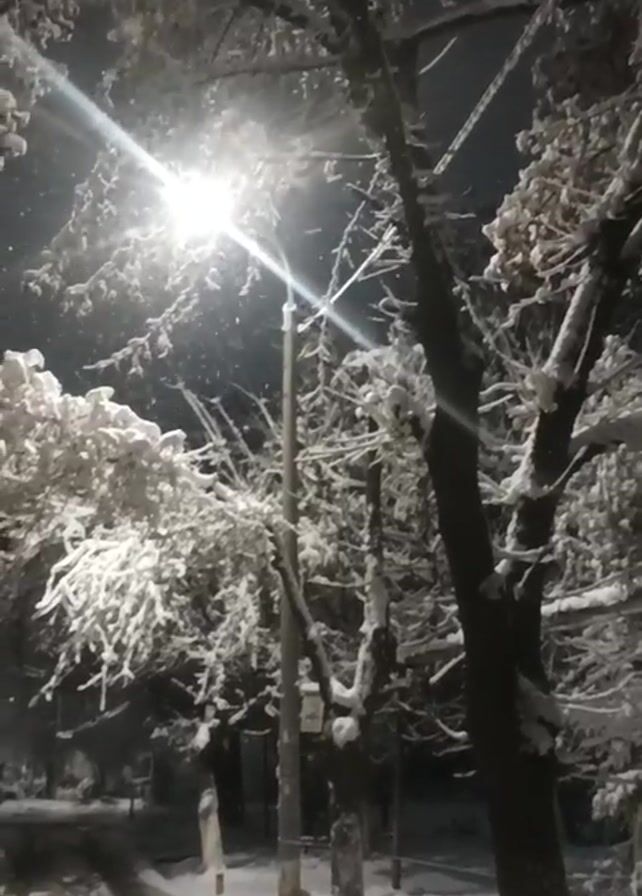 The scene is a snowy street at night, illuminated by a bright street light