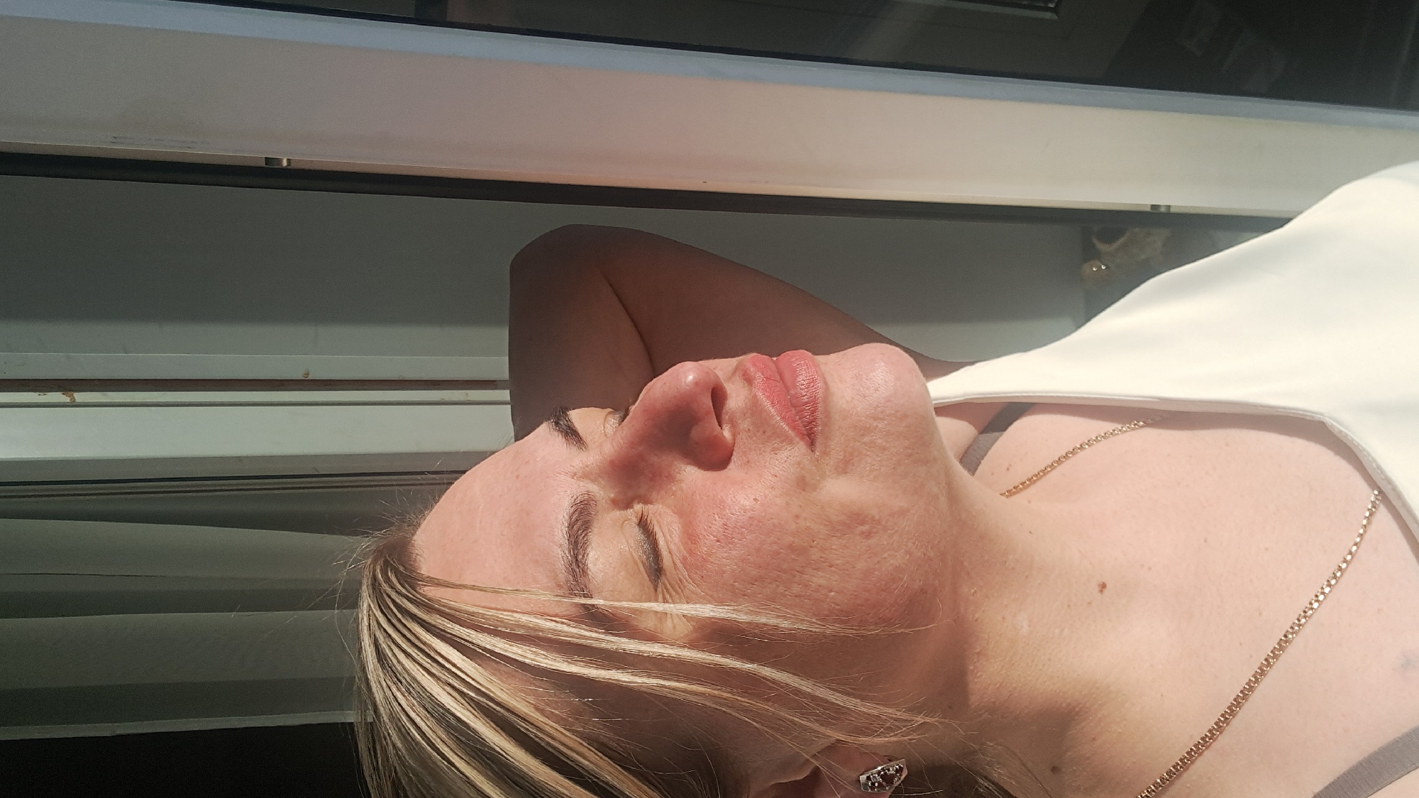 A person lies on their back. The face and part of the neck and upper chest are visible. The person's eyes are closed. Blonde hair is visible, with light-colored highlights. A gold necklace is around the person's neck. The person is wearing a light-colored top. Behind the person, there is a window with partially drawn blinds. The location is unknown and there is no indication of the city of Elektrostal, Russia.