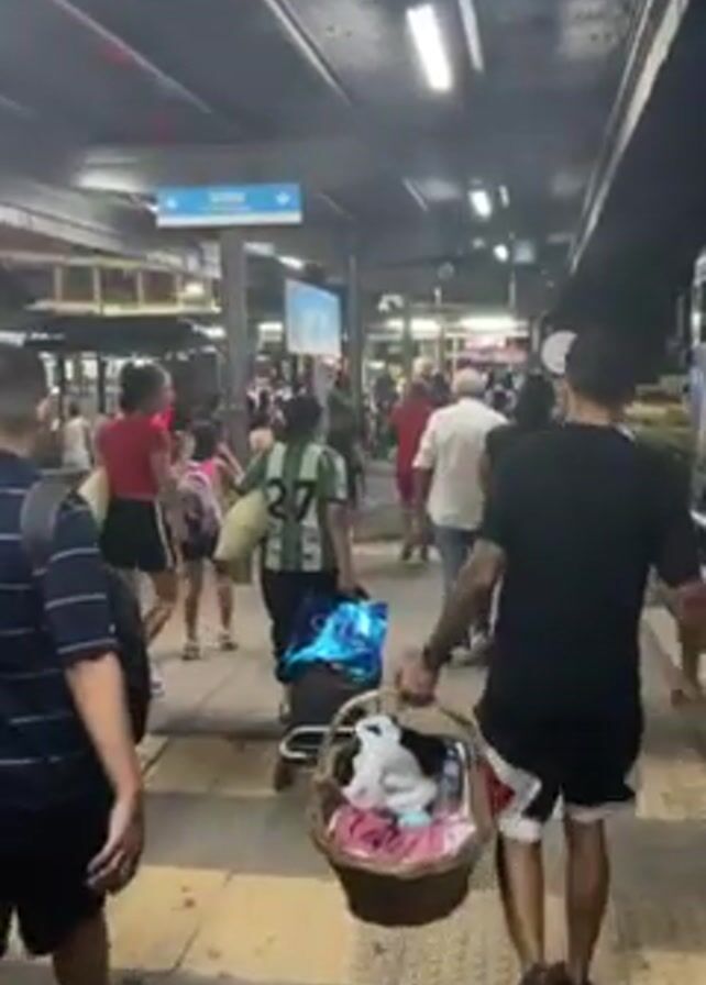 The video depicts a crowded train station platform, where people are walking in the same direction. Some are carrying bags, others are wheeling small carts. One man carries a basket filled with what appears to be clothing. A train is pulling into the station. A man in a blue striped shirt walks quickly toward the train. The station has overhead lighting and signage.