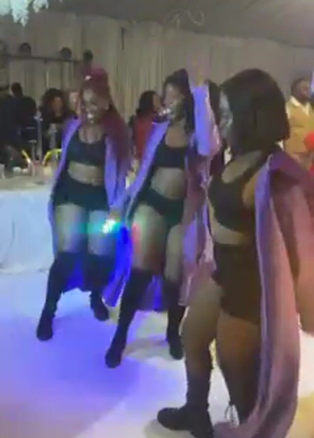 The video features three women dancing in what appears to be a party setting. They are all wearing similar outfits consisting of a black crop top, black shorts, black boots, and a long purple robe. One of the women is holding a light stick. They are moving and dancing in a coordinated manner. The background shows party decorations, including white drapery, tables, chairs, and other partygoers. There are also lights shining on the dance floor.